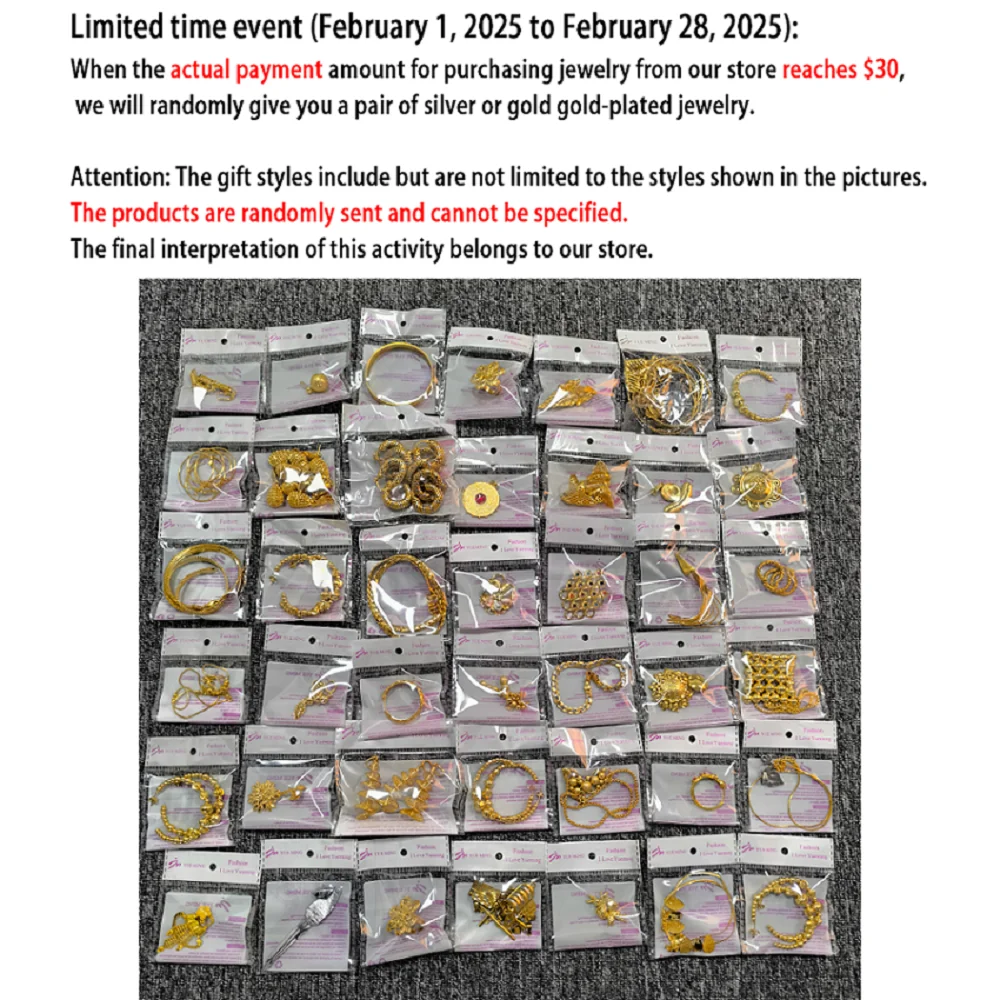 When the actual payment amount for purchasing jewelry from our store reaches $30,we will randomly give you a pair of silver or gold gold-plated jewelry.
